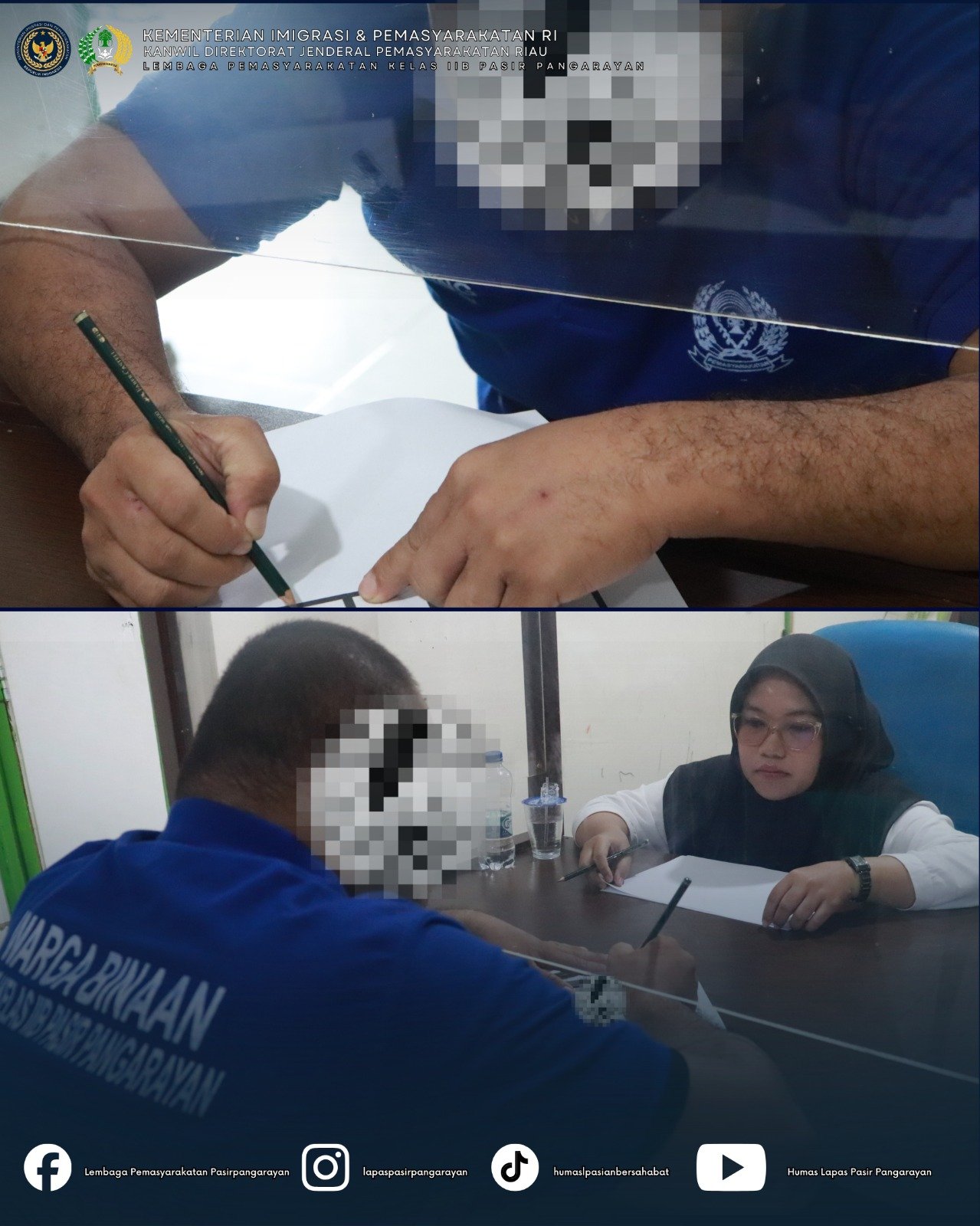 Kegiatan ini dilaksanakan oleh peserta Magang Nasional yang tengah menjalani praktik di Lapas Pasir Pangarayan. Mereka melakukan pemeriksaan dengan metode Self Reporting Questionnaire (SRQ-29), salah satu instrumen standar untuk mengidentifikasi potensi gangguan kesehatan jiwa melalui serangkaian pertanyaan terstruktur. Selain itu, dilakukan pula tes menggambar (Wartegg Test) guna melihat aspek kepribadian, pola pikir, dan kondisi emosional warga binaan.