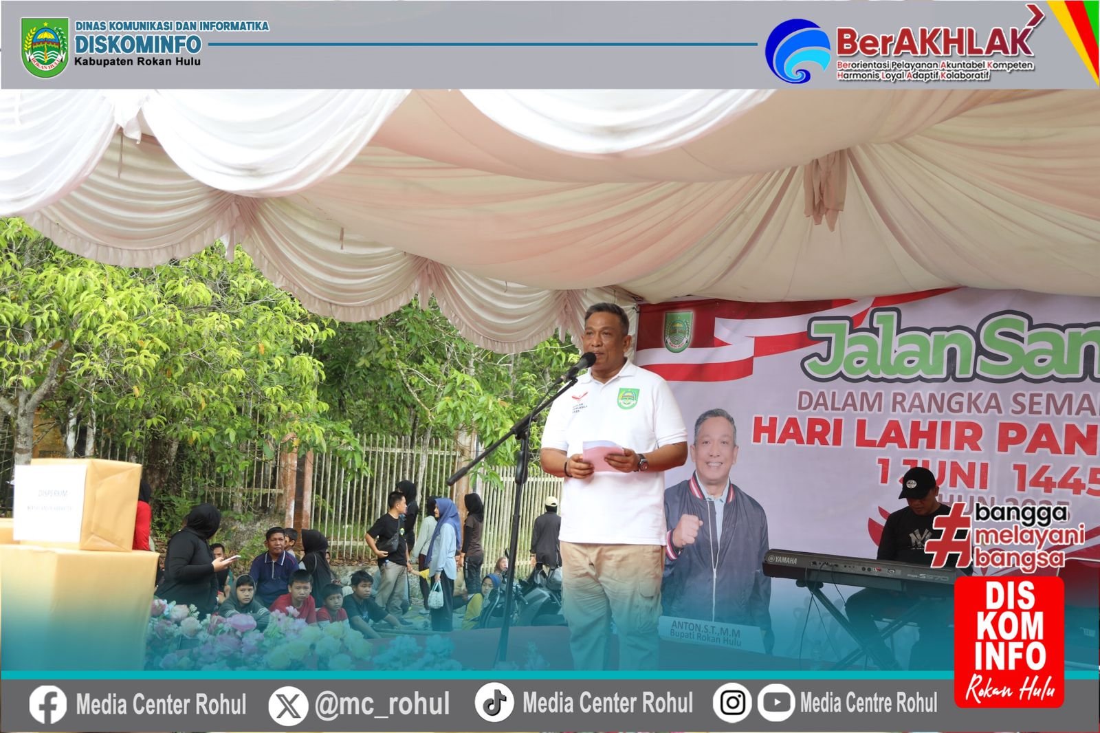 Dalam sambutannya, Bupati Rohul Anton, S.T, M.M menyampaikan berterima kasih kepada seluruh masyarakat yang telah hadir dan memeriahkan kegiatan jalan santai, semoga menjadi pengingat bahwa Pancasila merupakan dasar negara dan ideologi bangsa yang harus senantiasa dijaga dan dihayati dalam kehidupan sehari-hari.