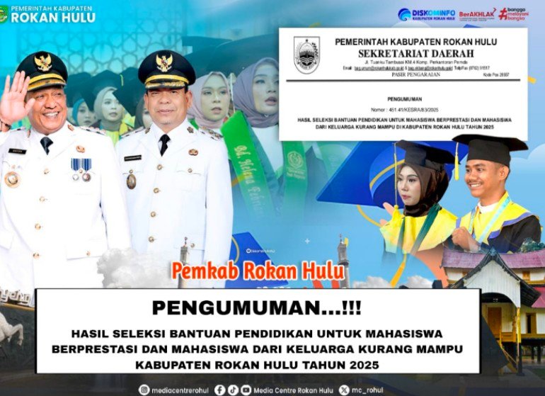 Rokan Hulu-Pemerintah Kabupaten Rokan Hulu resmi mengumumkan hasil seleksi bantuan pendidikan bagi mahasiswa berprestasi dan mahasiswa dari keluarga kurang mampu tahun anggaran 2025. Pengumuman ini menjadi angin segar bagi ratusan mahasiswa asal “Negeri Seribu Suluk” yang tengah menempuh pendidikan tinggi.