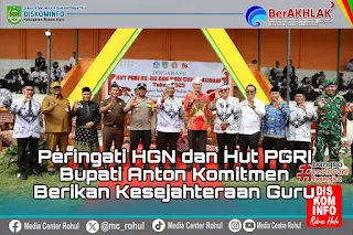 Peringatan HGN dan HUT PGRI ke-80 tingkat Kabupaten Rokan Hulu diawali dengan Upacara bersama yang dipimpin secara langsung oleh Bupati Rohul, Anton ST MM bertindak sebagai inspektur upacara.